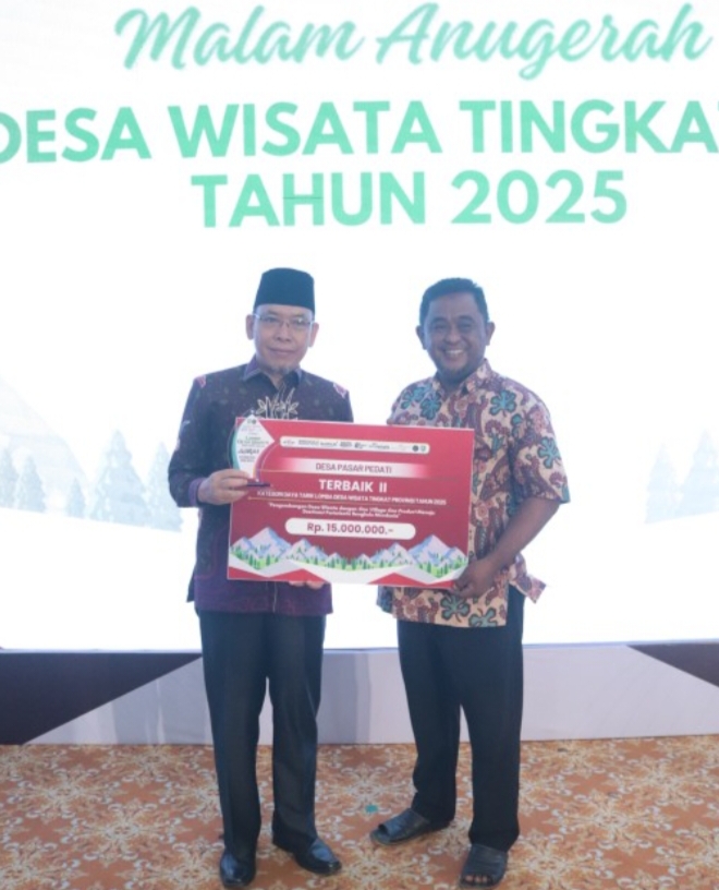 Kegiatan penyerahan penghargaan diberikan langsung oleh Gubernur Bengkulu H. Helmi Hasan, SE, Sementara tampak hadir dari Bengkulu Tengah Asistenu Admintrasi Umum H. Elyandes Kori, M.Si., di dampingi Kadis Pariwisata Bengkulu Tengah Edwar Novrin,.S.Sos., M.AP., dan Kades Pasar Pedati A. Ramadhan bertempat di Balai Raya Semarak Bengkulu. Rabu malam (19/11/2025).