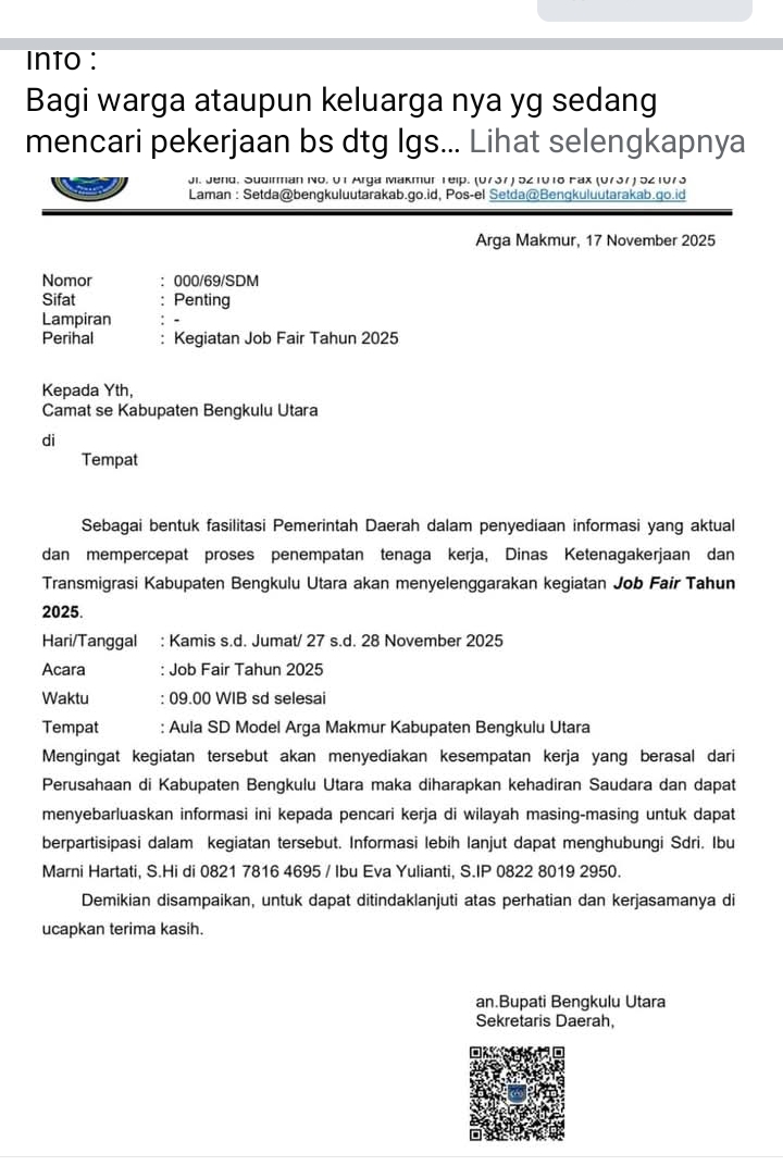 “Melalui penyelenggaraan Job Fair 2025, Pemkab Bengkulu Utara berharap dapat memperluas lapangan pekerjaan dan kesempatan kerja, menekan angka pengangguran, serta memperkuat sinergi antara pemerintah daerah, dunia usaha, dan masyarakat,” ujar Bupati Arie dalam pernyataannya, Sabtu (22/11/2025).