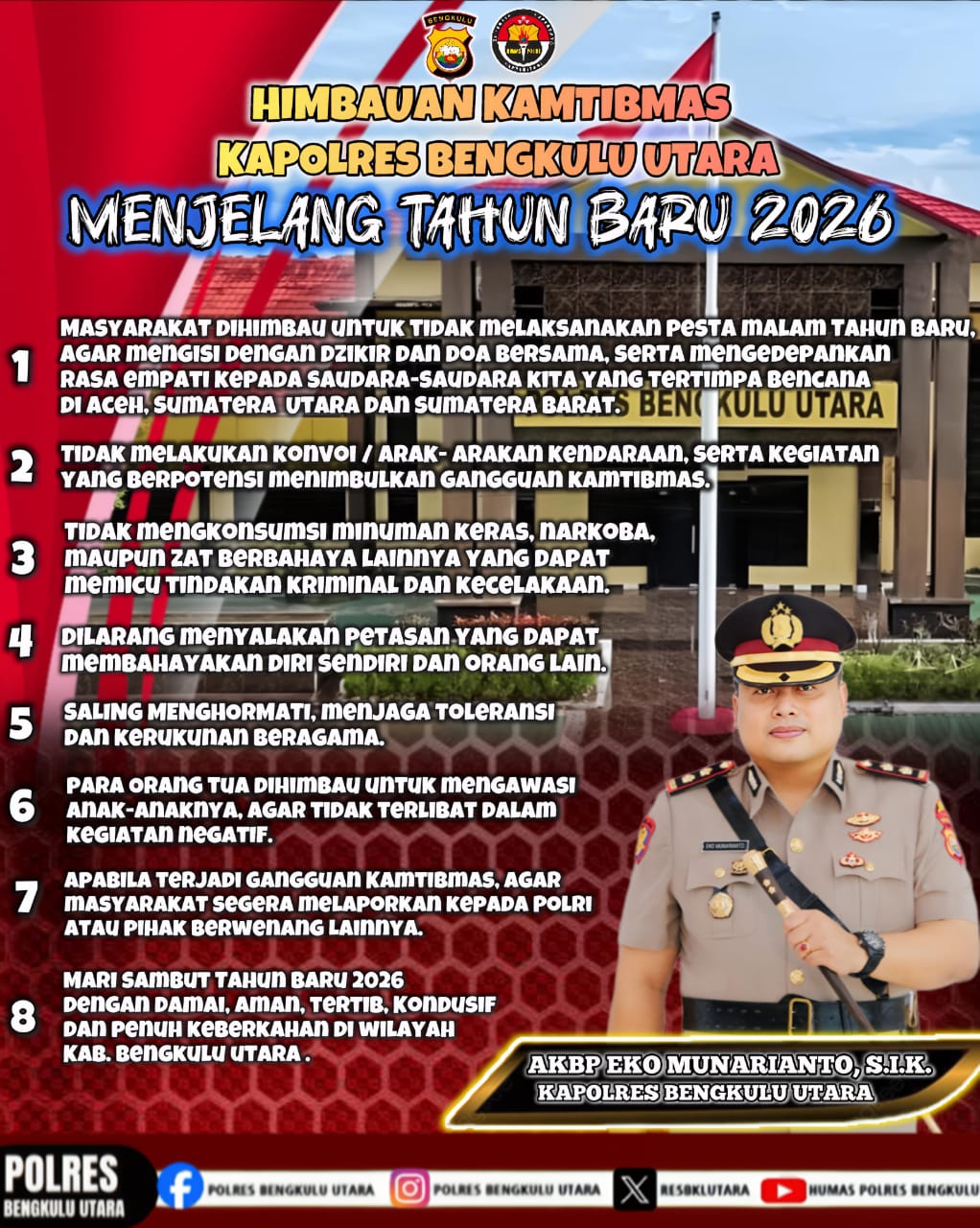 Selanjutnya, Kapolres juga memaparkan upaya-upaya yang telah dilakukan Polres Bengkulu Utara sepanjang tahun 2025 dalam menjaga keamanan dan ketertiban masyarakat. Beberapa langkah yang diambil antara lain adalah peningkatan patroli di daerah-daerah rawan kejahatan, pelaksanaan operasi penegakan hukum yang terarah, peningkatan kerja sama dengan aparat sipil (Linmas), lembaga masyarakat, dan swasta, serta program pencegahan kejahatan melalui penyuluhan dan pendidikan kepada masyarakat.